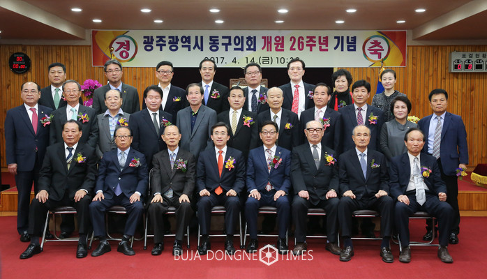| △광주광역시 동구의회는 김성환 동구청장을 비롯한 집행부 간부와 전직 의원을 초청하여 동구의회개원 26주년 기념행사를 갖었다 |