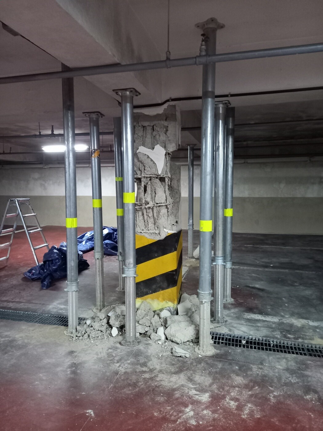 이어서 시는 사고 발생일인 17일 응급조치로 보조기둥 12개를 설치하고 18일 오전 파열기둥과 주변 기둥, 슬래브에 추가 파손을 방지하기 위한 잭-서포트 30본을 추가 설치했다.