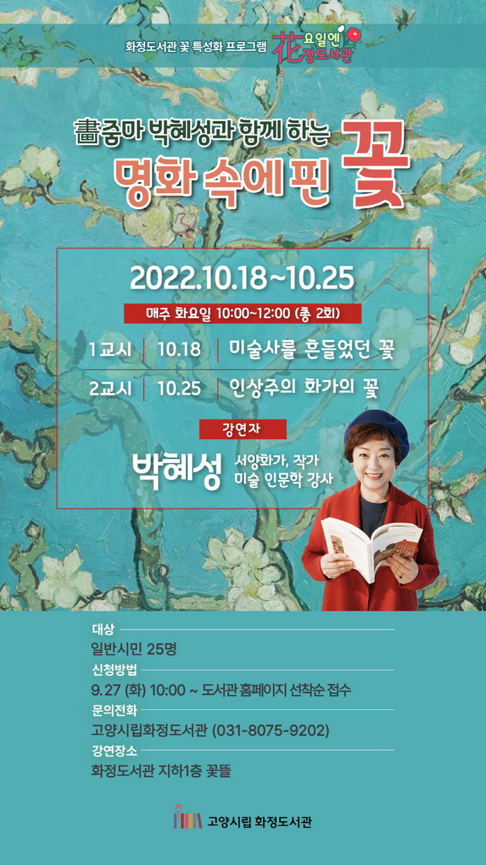 [부자동네타임즈 김인수기자] 고양특례시(시장 이동환) 꽃 특성화 도서관 화정도서관이 세계 미술사 속 재미있는 꽃 이야기를 알아보는 명화 속에 핀 꽃 강좌를 운영한다. 강좌는 10월 18일과 25일 매주 화요일 10시에 화정도서관 지하 1층에서 열린다.