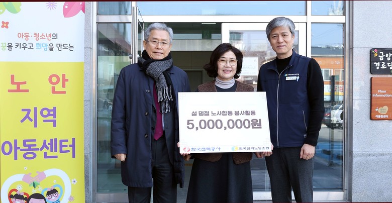 한국전력공사(대표이사 사장 김동철, 이하 한전)는 설 명절을 맞아 김동철 사장과 최철호 전국전력노조위원장이 1월 21일(화) 전라남도 나주 소재 ‘행복의 집’과 ‘노안지역아동센터’를 방문하여 따뜻한 명절을 보낼 수 있도록 온누리상품권을 전달하고 이웃사랑을 실천하였다고 밝혔다.