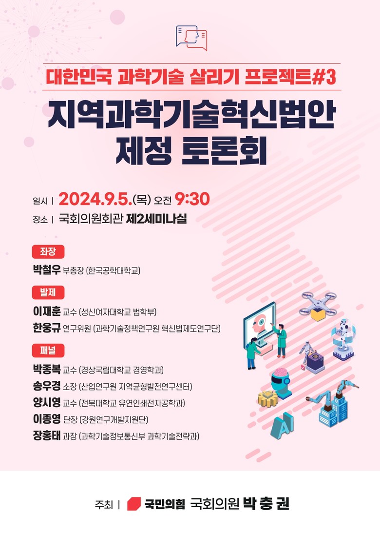 박충권 의원은 “ 과학기술이 침체된 지역에 활력을 불어넣고 , 과학기술 인재들이 지역에 정착하여 마음껏 연구할 수 있는 환경을 만들어 낼 수 있도록 법적 · 제도적 지원방안을 마련하기 위해 토론회를 개최했다 .” 라며 “ 이번 토론회에서 지역과학기술 주권 회복을 위한 건설적인 논의가 이루어지길 기대한다 ” 라고 밝혔다 .