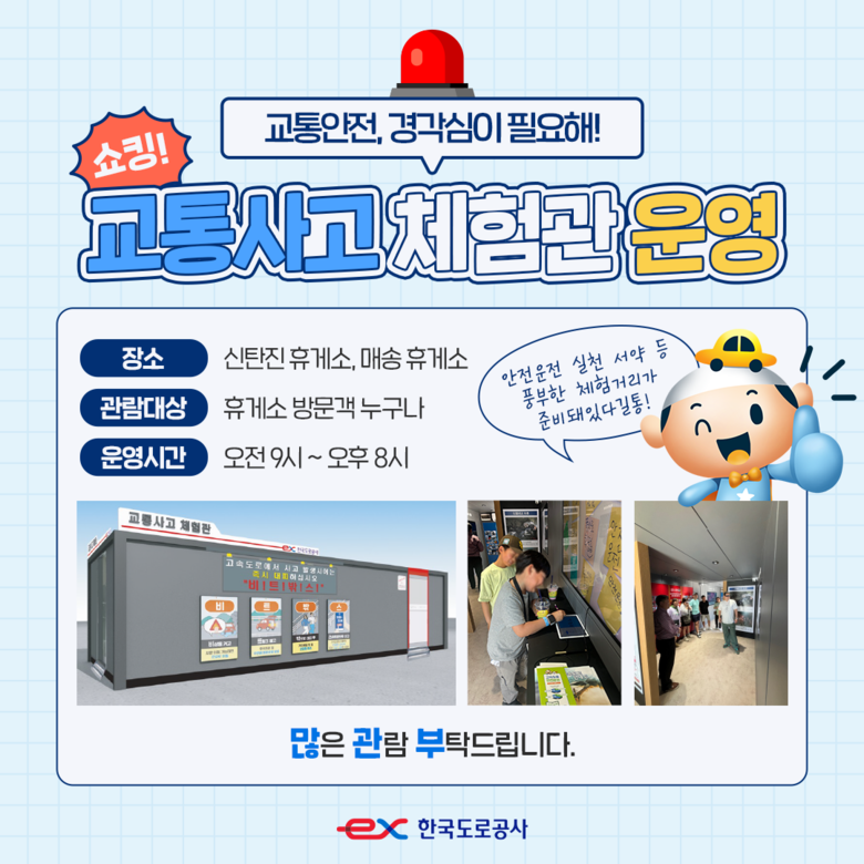 한국도로공사(사장 함진규)는 고속도로 이용객의 안전의식 향상을 위해 경부고속도로 신탄진휴게소(서울방향)와 서해안고속도로 매송휴게소(목포방향)에 ‘교통사고 체험관’을 운영한다고 밝혔다.