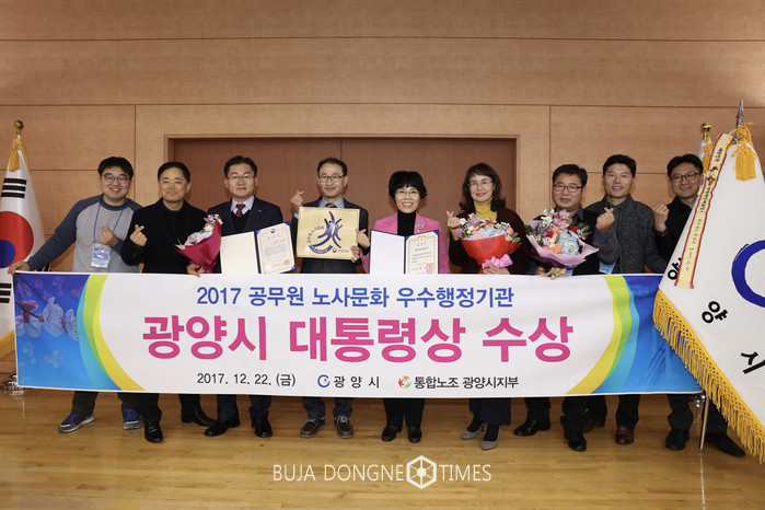 [부자동네타임즈 손권일 기자]광양시가 지난 12월 22일 정부서울청사에서 열린 시상식에서 2017년 공무원 노사문화 최우수행정기관 ‘대통령상’을 수상하는 영예를 안았다.