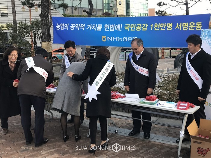 [부자동네타임즈 이현재 기자]NH농협은행 디지털뱅킹본부 임직원들은 24일 서울시 중구에 위치한 농협은행 본사 앞에서 농업의 공익적 가치를 헌법에 명시하기 위한 「농업가치헌법반영 1천만명 서명운동」에 나섰다.