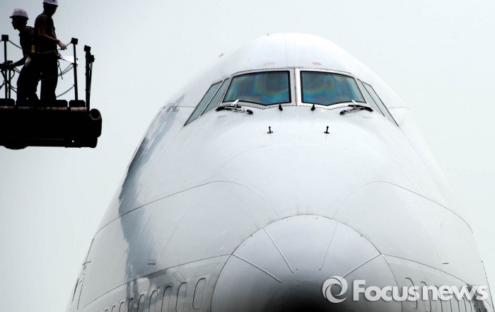 | △ 공항 격납고 밖에서 점검을 위해 대기 중인 화물기로 정비사를 태운 크레인이 접근하고 있는 모습. <사지넺공=포커스뉴스> |
