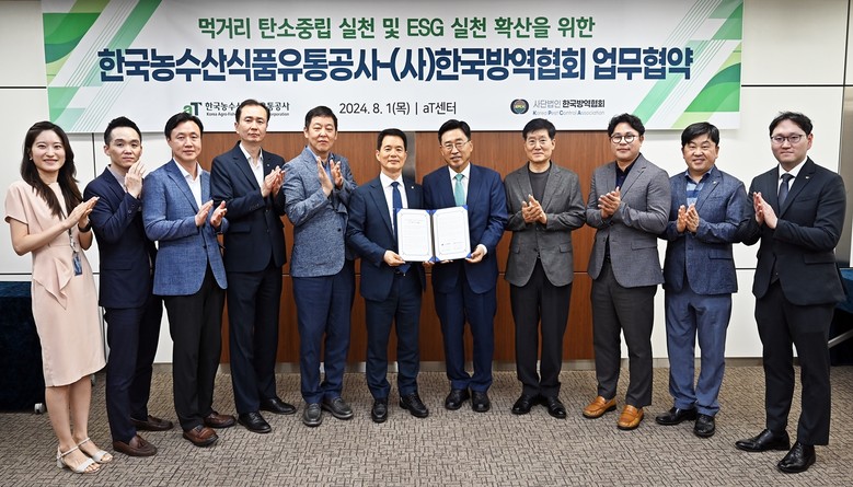 한국농수산식품유통공사(사장 김춘진)와 사단법인 한국방역협회(회장 김성수)는 1일 서울 양재동 aT센터에서 저탄소 식생활 확산과 ESG경영 강화를 위한 업무협약을 체결했다.