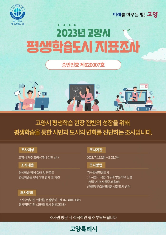 고양시는 2020년부터 매년 지표조사를 실시해왔다. 이에 그치지 않고 시는 조사의 객관성과 신뢰성을 높이기 위해 2022년 7월부터 국가통계 승인 절차를 진행했다. 같은 해 9월 ‘고양시 평생학습도시 지표조사’는 국가통계로 정식으로 승인 받았다.