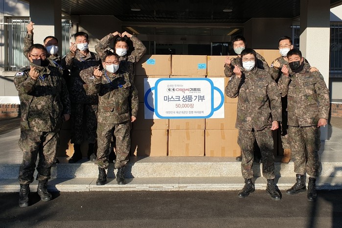 [부자동네타임즈 김인수기자] 국민 MC 송해와 함께하는 기부 릴레이에 참여하고 있는 대박싸기프트(대표 김형택)가 마스크 100,000장을 육군 제2군단과 육군 제8군단에 각각 50,000장씩 택배로 전달하였다(사진).
