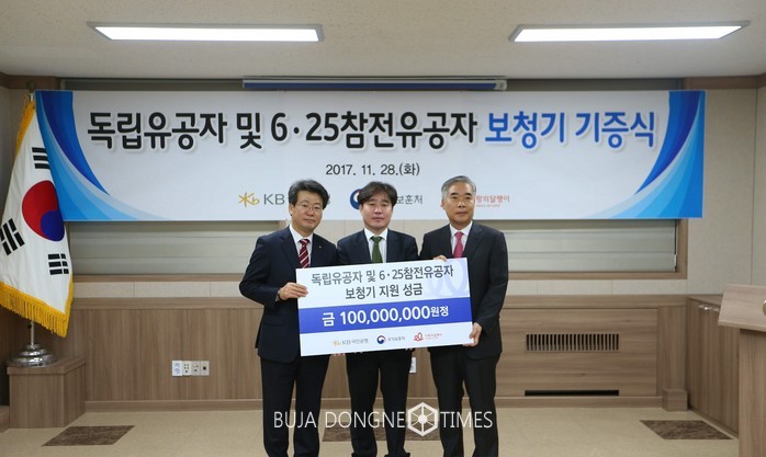 [부자동네타임즈 이현재 기자]KB국민은행은 28일, 서울지방보훈청에서「독립유공자 및 6.25 참전유공자 소리찾기」사업 지원을 위해 (사)사랑의 달팽이에 기부금 1억원을 전달했다고 밝혔다.