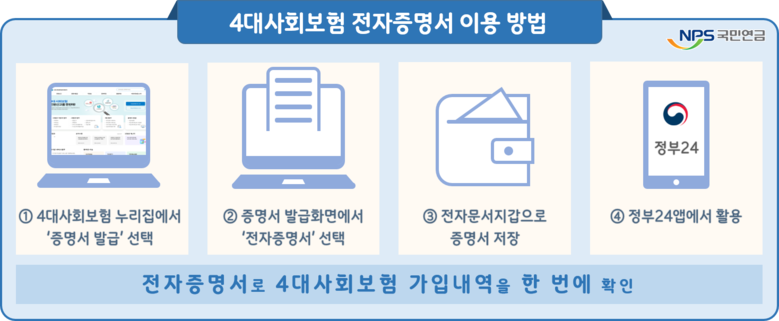 4대사회보험 전자증명서*는 사업장 또는 개인의 국민연금, 건강보험, 고용보험 및 산재보험 가입내역을 한 번에 확인할 수 있는 증명서로 4대사회보험 정보연계센터 누리집(www.4insure.or.kr)에서 신청할 수 있다.