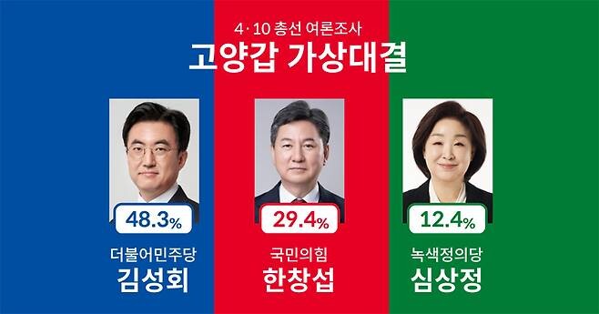 [부자동네타임즈 = 김인수 기자] 4·10 총선 고양갑 여론조사에서 더불어민주당 김성회 후보가 국민의힘 한창섭 후보와 녹색정의당 심상정 후보를 오차범위 밖에서 크게 앞서고 있는 것으로 나타났다.