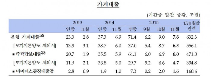 9일 한국은행이 발표한 '2015년 11월중 금융시장 동향'에 따르면 11월 은행권의 가계대출 잔액은 632조3000억원으로 10월보다 7조6000억원 늘었다.
