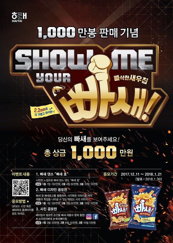 해태제과는 빠새 1,000만 봉 돌파를 기념해 SNS 고객 참여 이벤트를 펼친다. 이번 이벤트는 댄스, 사진, 디자인 세 분야로 나눠서 진행된다. 자신의 SNS에 클럽음악 '빠새호(show me your BBA SAE)'에 맞춰 춤을 추는 모습이나 빠새를 이용한 재미있는 사진 또는 빠새 일러스트를 해시태그와 함께 올리거나 해태제과 공식 홈페이지 이벤트 페이지에 업로드 하면 된다. 응모 기간은 1월 21일까지며 각 분야별로 우수작 5개를 선정해 총 1,000만원의 상금을 수여한다.