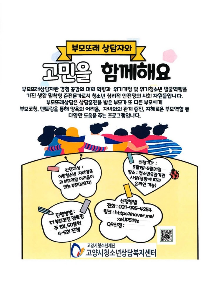 [부자동네타임즈 김인수기자] 고양시청소년재단(대표이사 박윤희)이 운영하는 고양시청소년상담복지센터(센터장 황상하)는 위기청소년 발굴과 부모멘토링 등 촘촘한 청소년 안전망 구축을 목적으로 5월부터 부모또래상담자와 자녀양육과 부모역할에 대해 고민을 함께 나눌 아동청소년 부모(보호자)를 모집한다고 밝혔다.