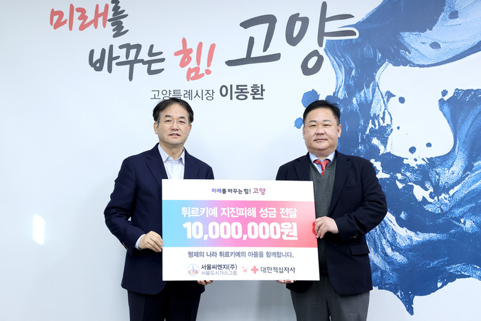 서울씨엔지(주) 배상준 대표는 고양시의 기부 캠페인을 기사로 접하고 후원을 결심했다며 “대규모 지진 피해로 어려움을 겪고 있는 튀르키예와 시리아 지역 주민들에게 조금이나마 힘이 되길 바란다. 피해가 신속히 복구돼 현지 주민들이 하루 빨리 일상으로 돌아올 수 있기를 기원한다”고 밝혔다.