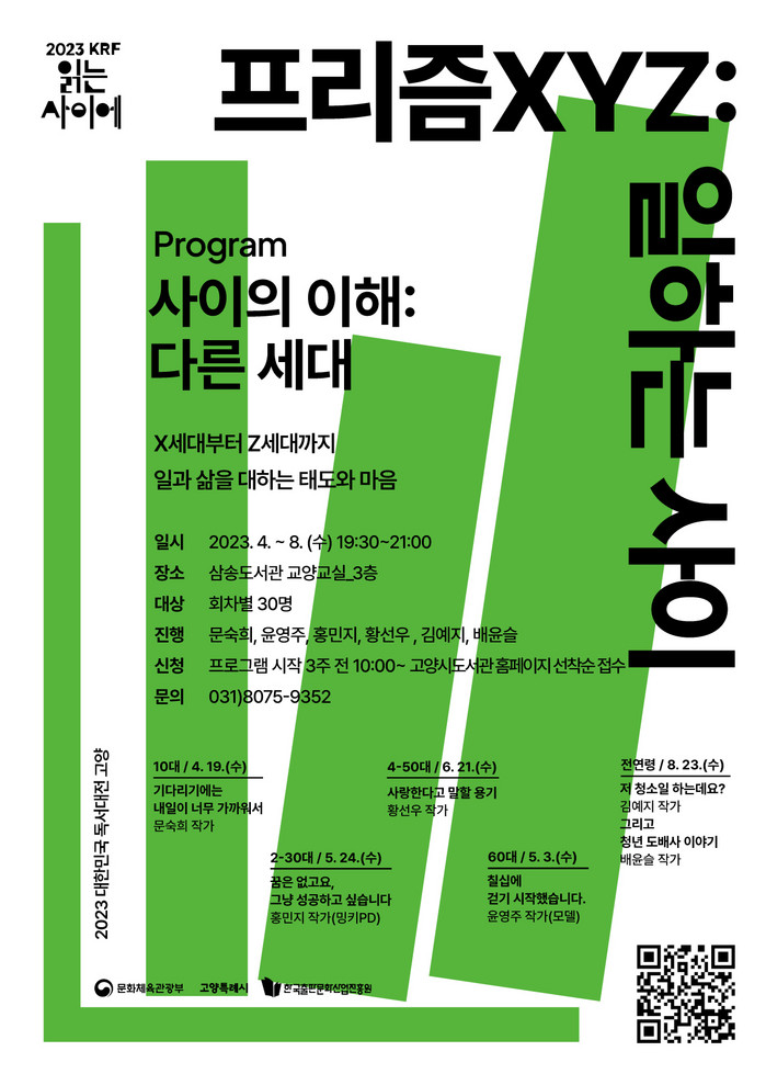 고양시는 제10회 2023 대한민국 독서대전 유치를 기념하여 〈프리즘 XYZ: 일하는 사이〉를 운영한다. ‘일’이라는 동일한 주제를 XYZ 세대의 각기 다른 시선으로 바라보고 이야기해보는 기획 프로그램이다.