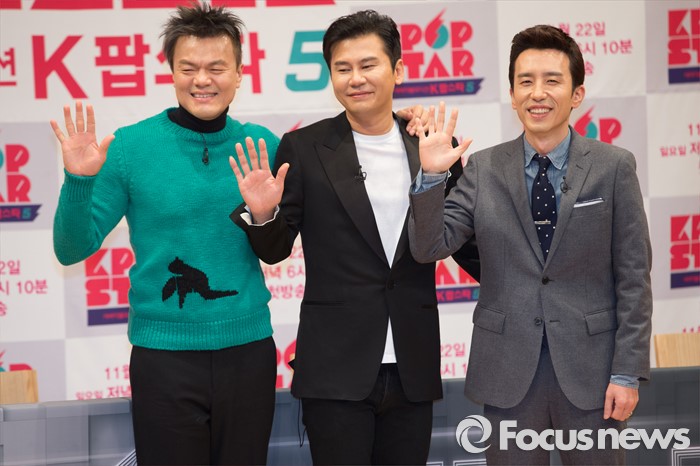 (서울=포커스뉴스) 16일 오후 서울 양천구 SBS 목동사옥에서 열린 '서바이벌 오디션 K팝스타 시즌5' 제작발표회에 참석한 박진영(왼쪽부터), 양현석, 유희열이 포토타임을 갖고 있다.