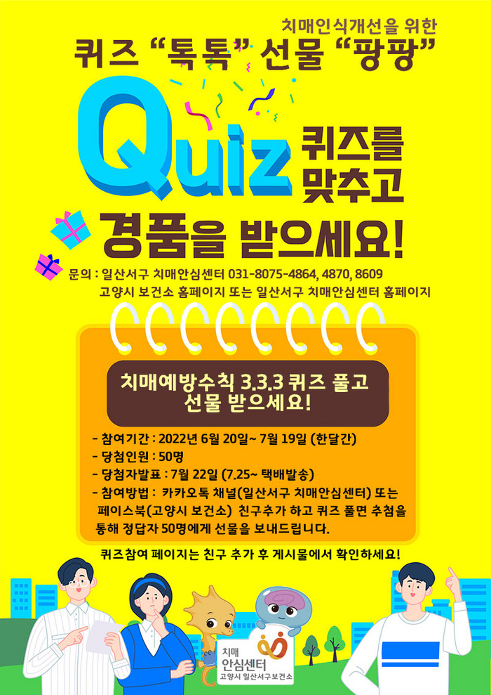 이벤트는 고양시민 누구나 참여 가능하며 6월 20일부터 7월 19일까지 진행된다. 카카오톡 채널에서 ‘일산서구 치매안심센터’를 친구 추가 하거나 페이스북 ‘고양시 보건소’를 친구 추가 한 후, 게시된 링크나 QR코드로 접속하여 치매 관련 퀴즈를 풀면 된다.