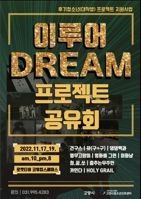 [부자동네타임즈 김인수기자] 고양시청소년재단 고양시청소년진로센터에서는 후기청소년(대학생)들의 꿈⋅도전⋅성장을 지원하는 「이루어DREAM」 프로젝트가 종료됨에 따라 11월 17일부터 19일까지 3일간 프로젝트 결과를 라페스타 B동 4층 로켓티어에 전시하여 지역사회에 공유한다.