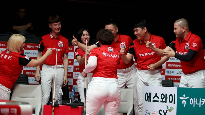 블루원은 하나카드를 상대로 첫 세트서 강민구와 짝을 이룬 다비드 사파타(스페인)가 3이닝째 하이런 7점을 쓸어 담는 활약으로 무랏 나시 초클루-신정주를 5이닝만에 11:2로 제압했다. 곧이어 나선 여자복식(2세트)서는 서한솔과 짝을 이룬 김민영이 홀로 뱅크샷 3차례를 포함, 9득점을 몰아치는 원맨쇼로 사카이 아야코(일본) 홀로 6득점에 그친 아야코-김진아 조합을 9:6(10이닝)으로 돌려세웠다. 1라운드 복식서 전패(8패)한 김민영은 서한솔과의 팀리그 여자복식 첫 승리를 신고했다.