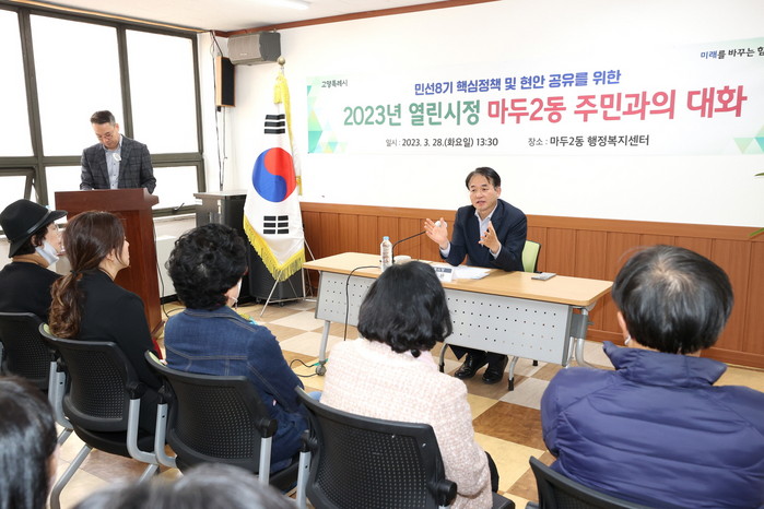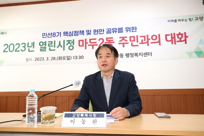 [사진설명] 마두2동 주민과 이동환 고양특례시장이 주민과의 대화를 진행하고 있다.