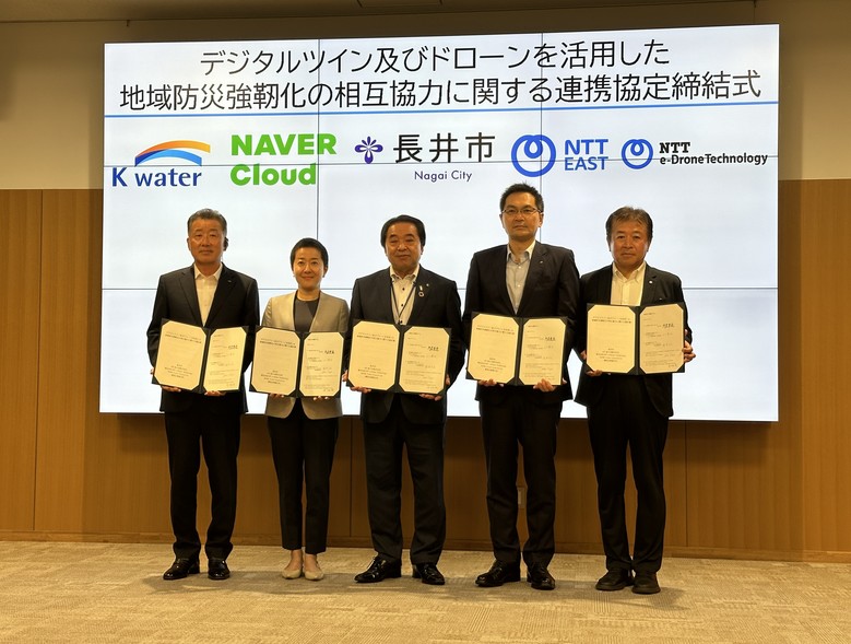한국수자원공사는 8월 6일 일본 나가이 시청에서 나가이시(시장 우치야 시게하루), NTT동일본주식회사(사장 시부타니 나오키)*, 주식회사 NTT이드론 테크놀로지(사장 타키자와 마사히로), 네이버 클라우드(대표 김유원)와 디지털트윈 및 드론 기반 재난 대응 역량 강화를 위한 업무협약을 체결했다.