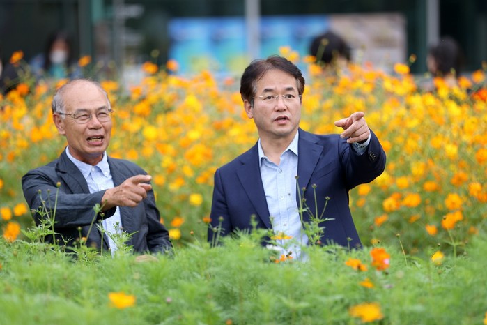 [사진설명] (오른쪽부터)이동환 고양시장과 권기현 고양시화훼연합회장이 10월 1일 일산호수공원에서 열린 2022고양가을꽃축제 개막식을 앞두고 환담하고 있는 모습.