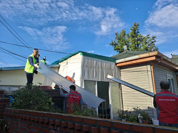 화전동 지역사회보장협의체와 고양신도라이온스클럽은 누수 피해를 입은 장애인 가정에 지붕 방수공사를 실시하고, 독거 노인 가정에는 캐노피 및 물받이를 설치했다. 더불어 방풍작업도 추가로 실시했다.