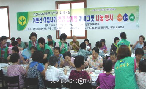 익산시새마을부녀회는 8월11일 함열 빛내리교회에서 계속되는 폭염과 열대야로 지친 어르신 300여명을 대상으로 ‘여름나기 건강 삼계탕’을 대접했다.