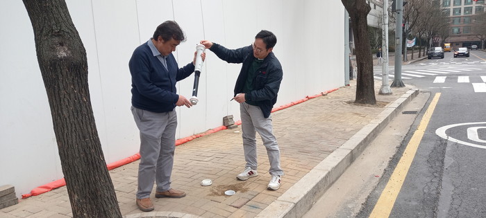[사진설명] 일산동구 백석동 인근 공사현장에 지반침하 감지기를 설치하고 있다.