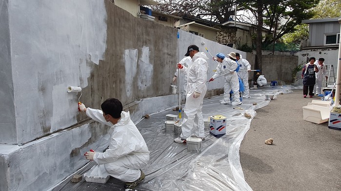 이날 봉사활동으로 이끼가 끼어있던 빌라 외부담장이 새하얗게 변신했고 구청 지원으로 경로당 외벽도 깔끔하게 단장을 마쳤다.