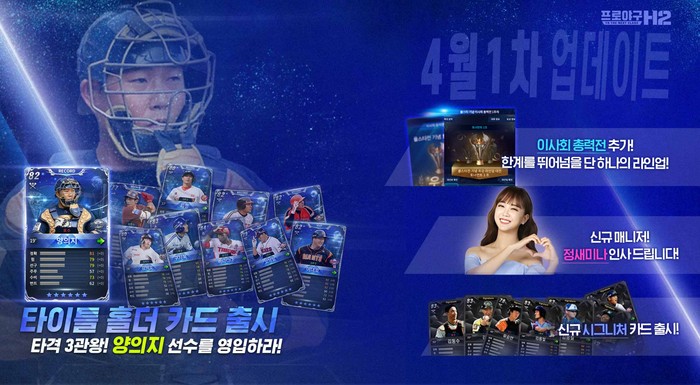 프로야구 H2 이용자는 ▲신규 매니저 정새미나 아나운서와 다양한 룩(look) 상품 ▲신규 시그니처 선수 4명 ▲코치 강화 확률업 이벤트 등의 콘텐츠를 즐길 수 있다.