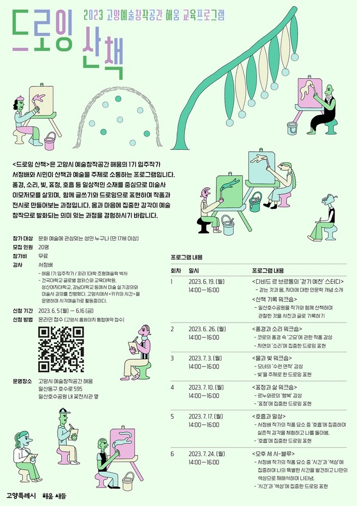 참가자들은 작가와 함께 일산호수공원을 산책하고, 미술사를 학습하며 표현법을 익힐 수 있다. 또한 ‘풍경, 소리, 빛, 표정, 호흡’ 등 일상적인 소재를 중심으로 미술 이모저모를 살필 수 있다.