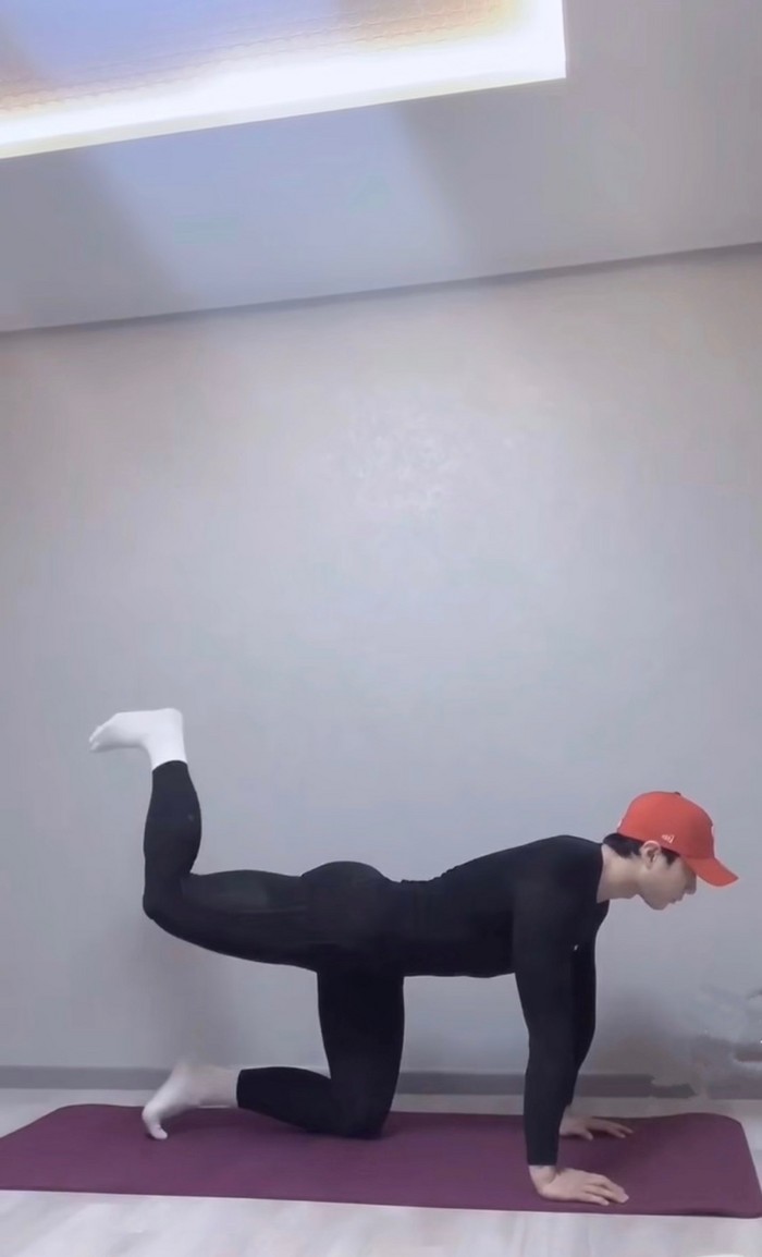 -동일한 자세에서 다리 한쪽 무릎을 펴준다.