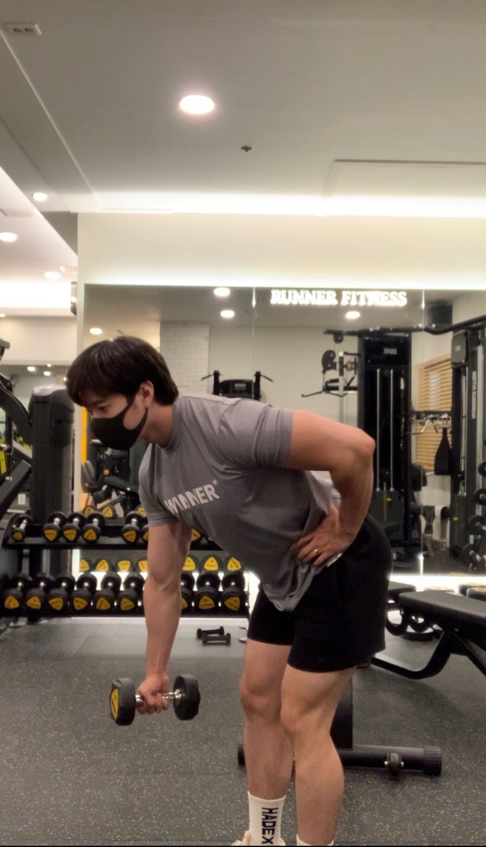 다리힘으로 균형을 잡으면 덤벨을 몸을 스치듯이 당겨주며 호흡을 내뱉는다.