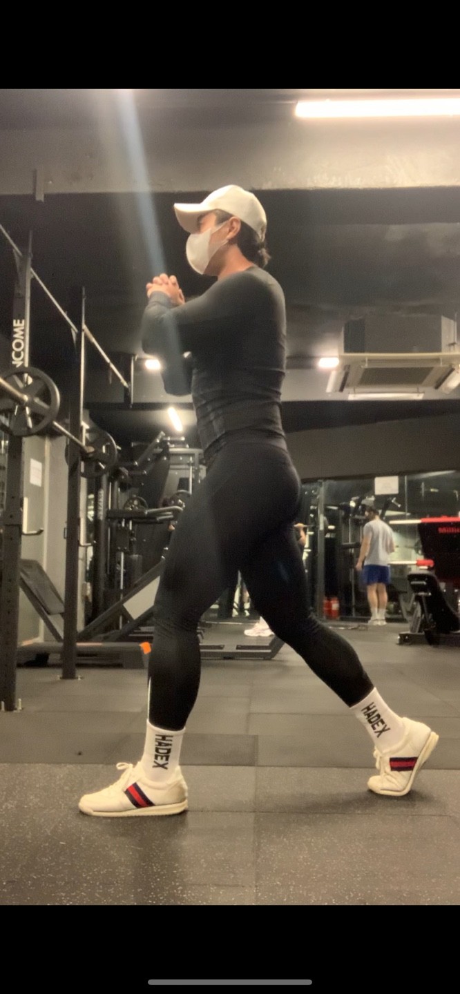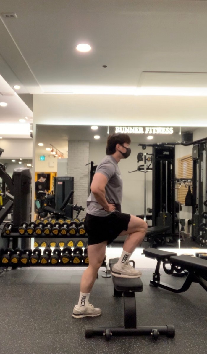 다리를 앞뒤로 넓게 벌려주고 정면을 응시 후에 앞쪽 무릎이 발가락보다 앞으로 나가지 않게 수직으로 앉았다 일어선다.