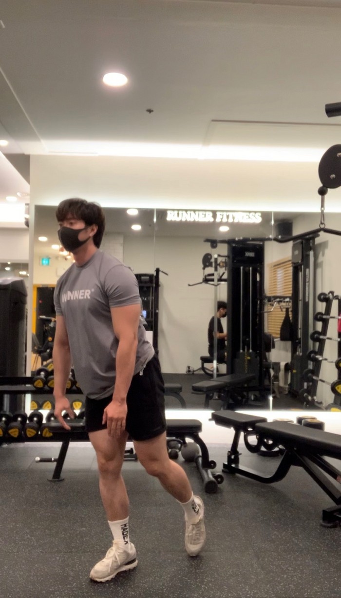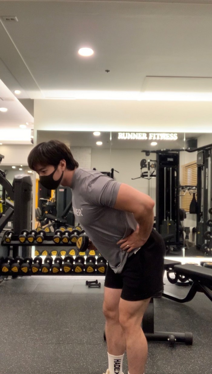 벤트오버 자세로 앞으로 인사하듯 숙여준 다음 한쪽 손에는 덤벨을 들고 있는다.