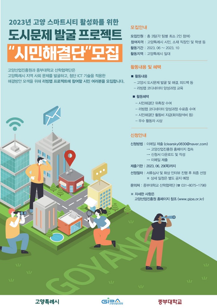 [부자동네타임즈 김인수기자] 고양산업진흥원(원장 오창희)은 6월 29일(목)까지‘2023년 고양 스마트시티 문제 발굴 리빙랩 사업’에 참여할 시민해결단을 공개 모집한다.