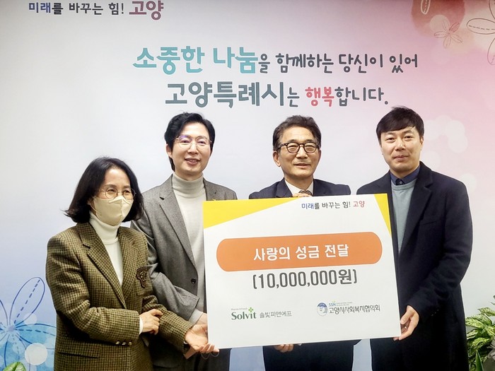 [부자동네타임즈 김인수기자] 고양특례시는(시장 이동환) 지난 31일 ㈜솔빛피앤에프에서 이웃사랑 나눔을 위해 사랑의 성금 1천만 원을 기부했다고 말했다.