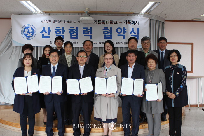 | △목포가톨릭대학는 전남도 산학협력 취업패키지 사업의 일환으로 가족회사 32개 기관과 산학협력 협약식을 진행하였다(매일경제 사진 제공) |