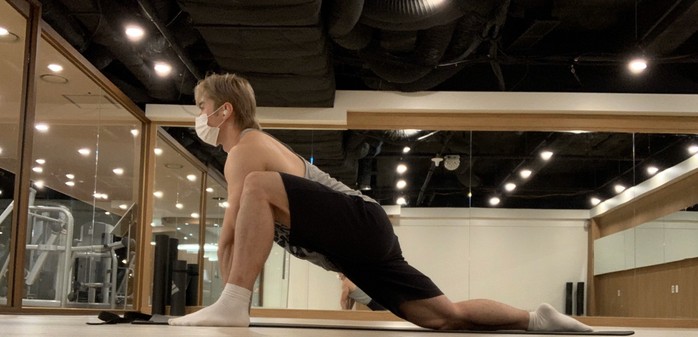 엉덩이 밑까지 자세에서 주저 앉고 한쪽 무릎을 다리와 다리 사이로 넣어준다. 한쪽이 끝나면 반대쪽도 동일하게 실시. 이 동작이 조금 어렵다면 무릎을 약간 접은 상태에서 앉아준다. 양손은 몸통 위에 기대고 양쪽다리를 양 옆으로 회전하면서 지면에 무릎이 닿도록 회전시킨다. 세트 3set. 왕복 10~15회.