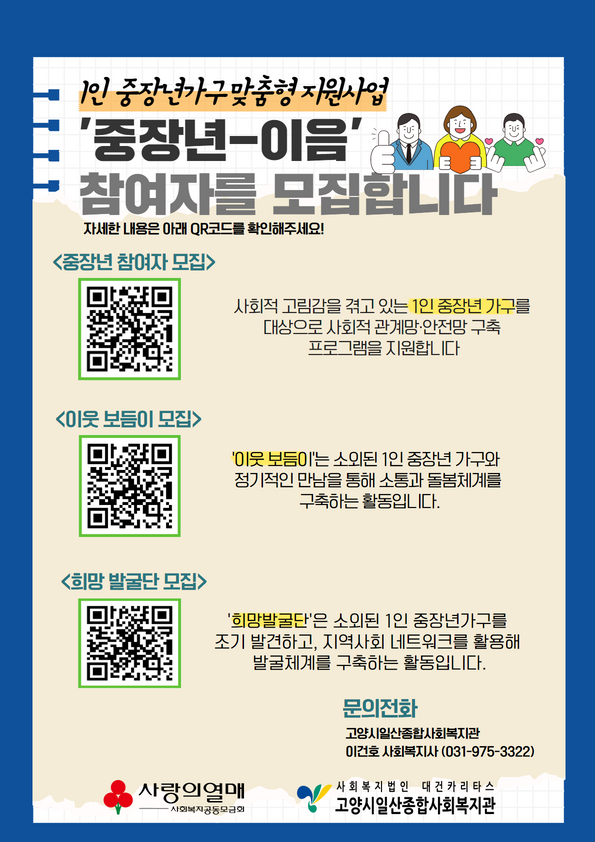 ‘중장년-이음’ 참여 희망자는 고양시일산종합사회복지관 방문 및 전화, 홈페이지, 포스터 내 QR코드를 통해 신청할 수 있다. 또한 주변에 어려운 중장년이 있다면 누구든 관계없이 추천 가능하다.