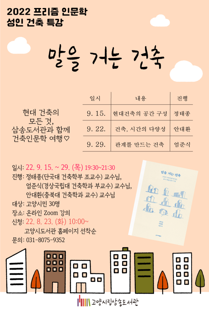 9월 8일부터 9월 29일까지 매주 목요일 저녁에 온라인(Zoom)으로 진행되는 ‘말을 거는 건축’은 8월 23일부터 도서관 홈페이지에서 신청할 수 있다. 보다 더 자세한 내용은 홈페이지를 참고하거나 삼송도서관(☎031-8075-9352)으로 문의하면 된다.