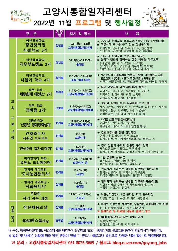 자세한 내용은 홈페이지나 블로그에서 확인 또는 고양시통합일자리센터(☎031-8075-3665)로 문의하면 된다.