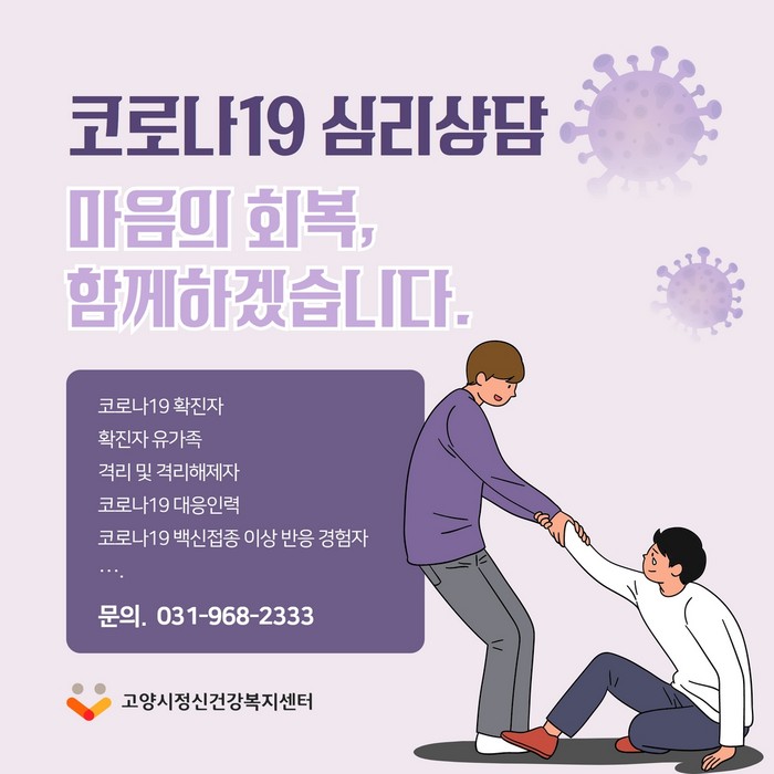 우울, 불안, 무기력감 등 일상생활의 변화로 어려움을 겪고 있는 고양시민은 고양시정신건강복지센터(☎031-968-2333)의 도움을 받을 수 있다.
