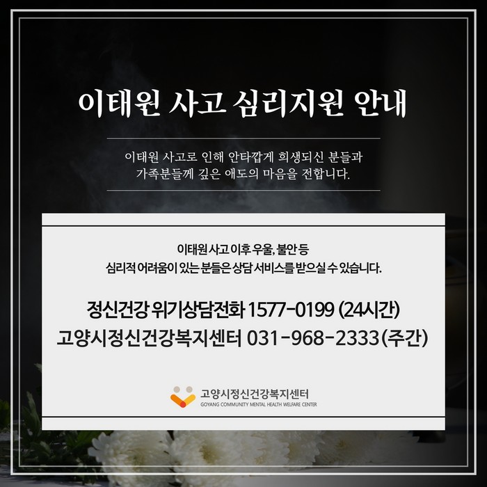 사고 목격자, 간접적인 영향으로 심리적 어려움이 있는 시민은 정신건강 위기상담전화(☎1577-0199) 또는 고양시정신건강복지센터(☎031-968-2333)로 연락하면 상담 서비스를 이용할 수 있다.
