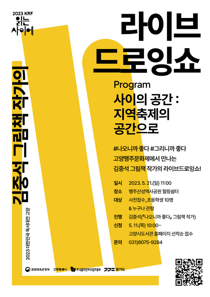 독서대전 협력 프로그램인 ‘김중석 그림책 작가의 라이브 드로잉쇼’는 5월 21일(일) 오전 11시 행주산성역사공원 힐링쉼터 무대에서 펼쳐진다.