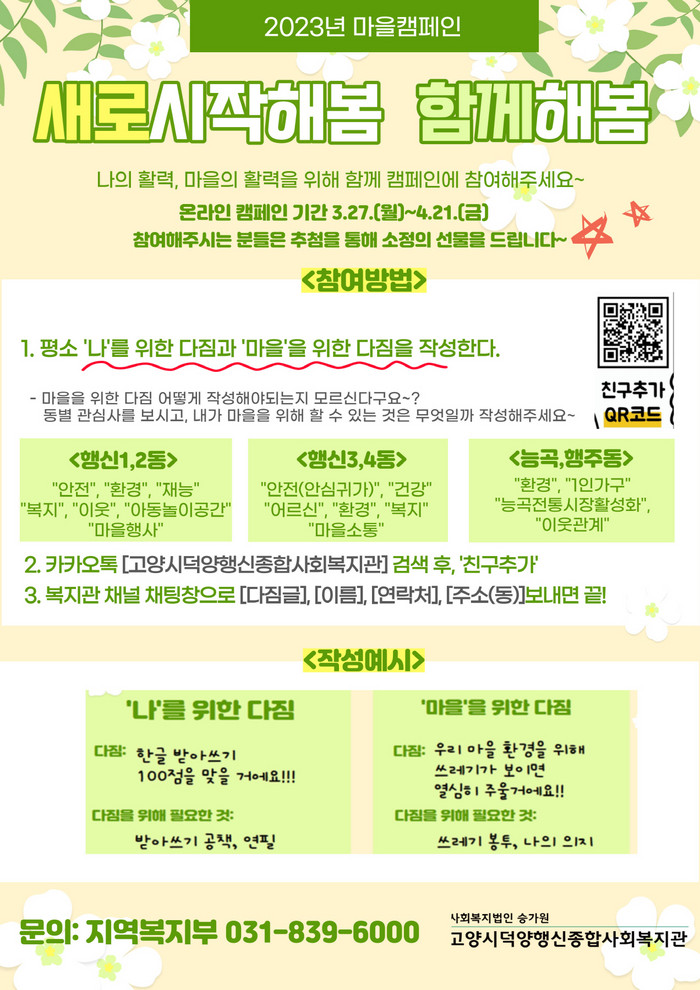 마을 캠페인 ‘새로 시작해 봄, 다시 해 봄’은 봄을 맞이해 내가 이루고 싶은 다짐과 행신동, 능곡·행주동의 각종 마을 의제를 해결하기 위한 다짐을 작성하고 그 다짐을 이루기 위해 필요한 물품을 추첨을 통해 제공하는 방식으로 진행된다.