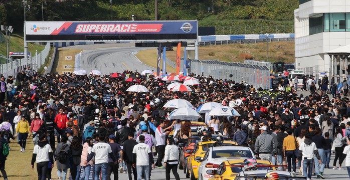 [사진설명] 지난 2019년 에버랜드 스피드웨이에서 열린 CJ대한통운 슈퍼레이스 챔피언십 최종전에서 역대 최다관중이 모여든 가운데 그리드워크 행사가 진행되고 있다.