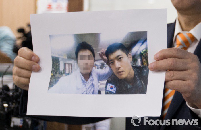 | △ 지난 9월 17일 오후 서울 서초구 서초대로 법무법인 청파에서 방송인 김현중 측 법률대리인 이재만 변호사가 DNA 검사를 위해 머리카락을 채취하는 김현중 사진을 공개하고 있다. <사진제공=포커스뉴스> |